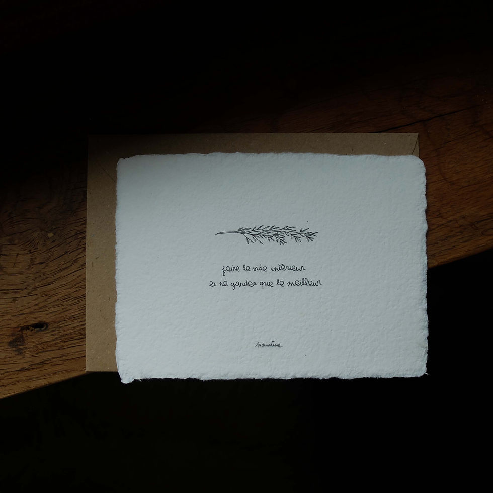 Toutes les cartes sont en papier fait à la main artisanalement et imprimées une à une par mes soins dans mon petit atelier en haut de la colline en Corrèze. Je précise aussi que toutes les illustrations et messages et poésies sont issues de mes propres créations et ne sont donc pas libres de droits.