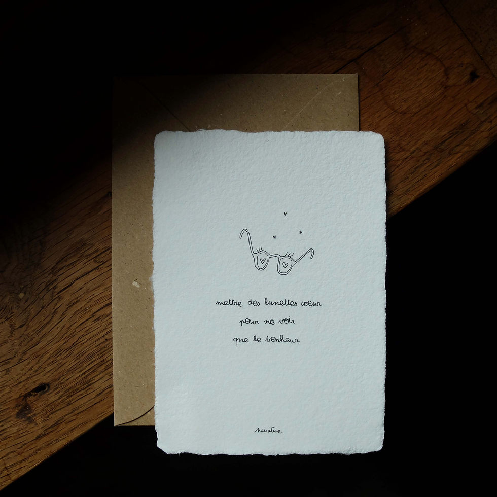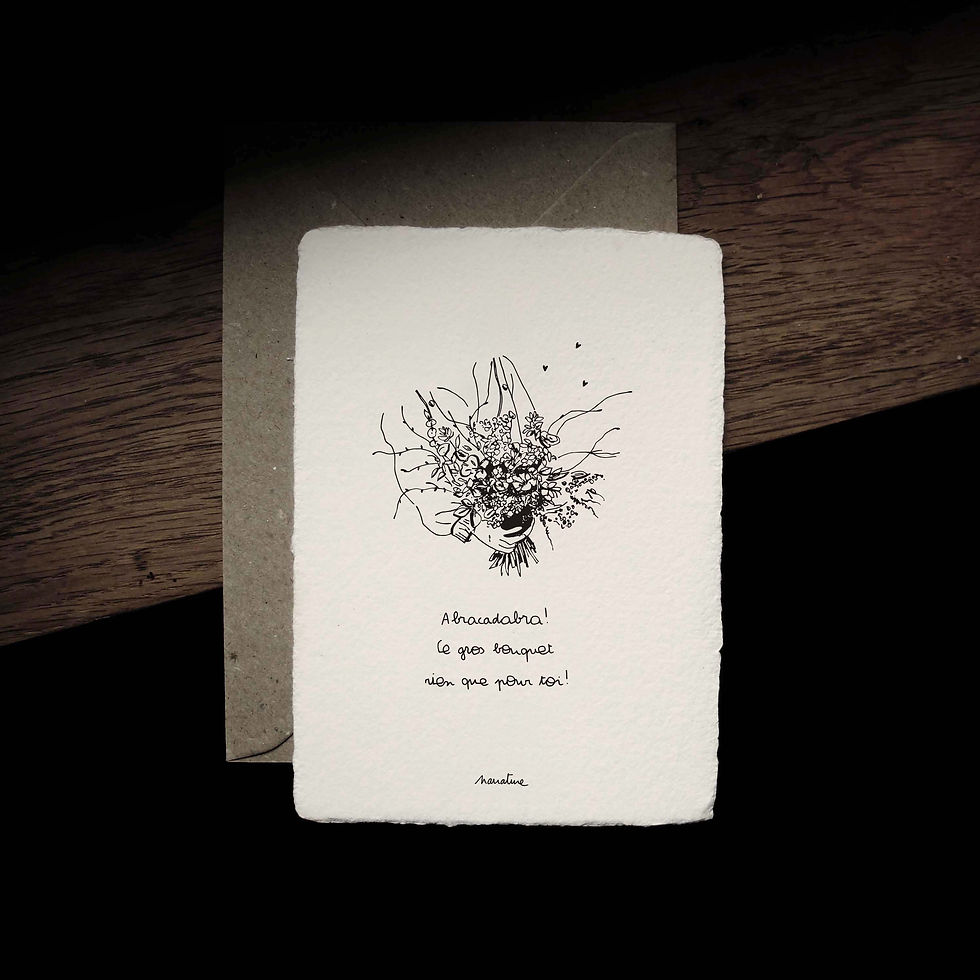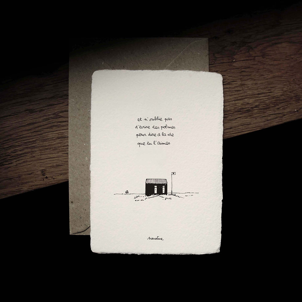 Toutes les cartes sont en papier fait à la main artisanalement et imprimées une à une par mes soins dans mon petit atelier en haut de la colline en Corrèze. Je précise aussi que toutes les illustrations et messages et poésies sont issues de mes propres créations et ne sont donc pas libres de droits.